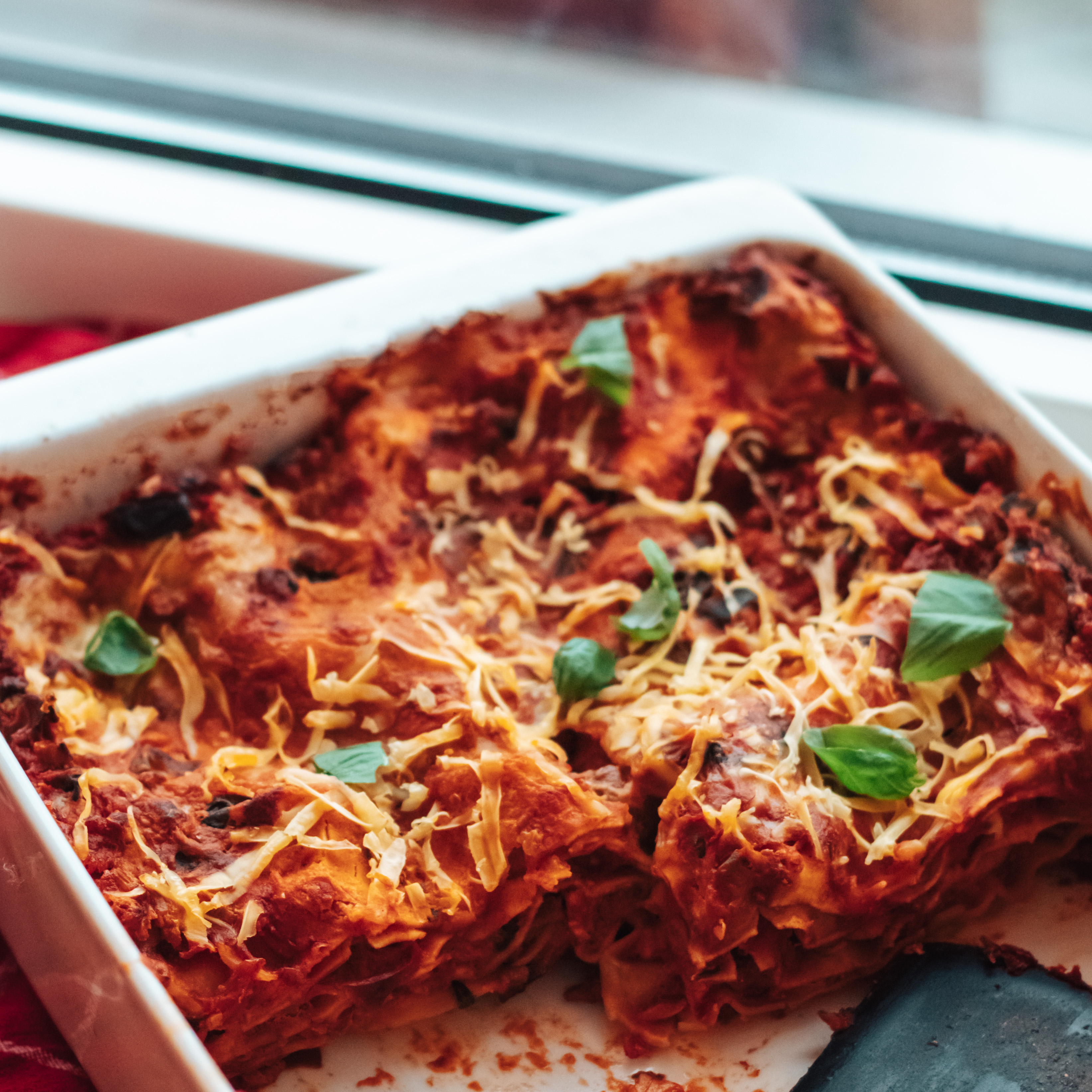 - Tijd om de lasagne te bouwen: schep een klein beetje van de saus op de bodem van de ovenschaal. Dit zorgt ervoor dat ook de onderste laag van de lasagnebladen gaart. Leg er vervolgens lasagnebladen op. Schep nu een mooie laag saus op de bladen en verspreidt dit over alle bladen. Doe hetzelfde met een beetje bechamelsaus. Dek af met lasagnebladen. Herhaal dit proces tot de schaal bijna tot de rand gevuld is (laat ongeveer 0,5-1cm over). Schep op de laatste laag lasagnebladen een beetje saus en eindig met veel bechamelsaus. Strooi hier overheen eventueel nog wat plantaardige geraspte kaas.