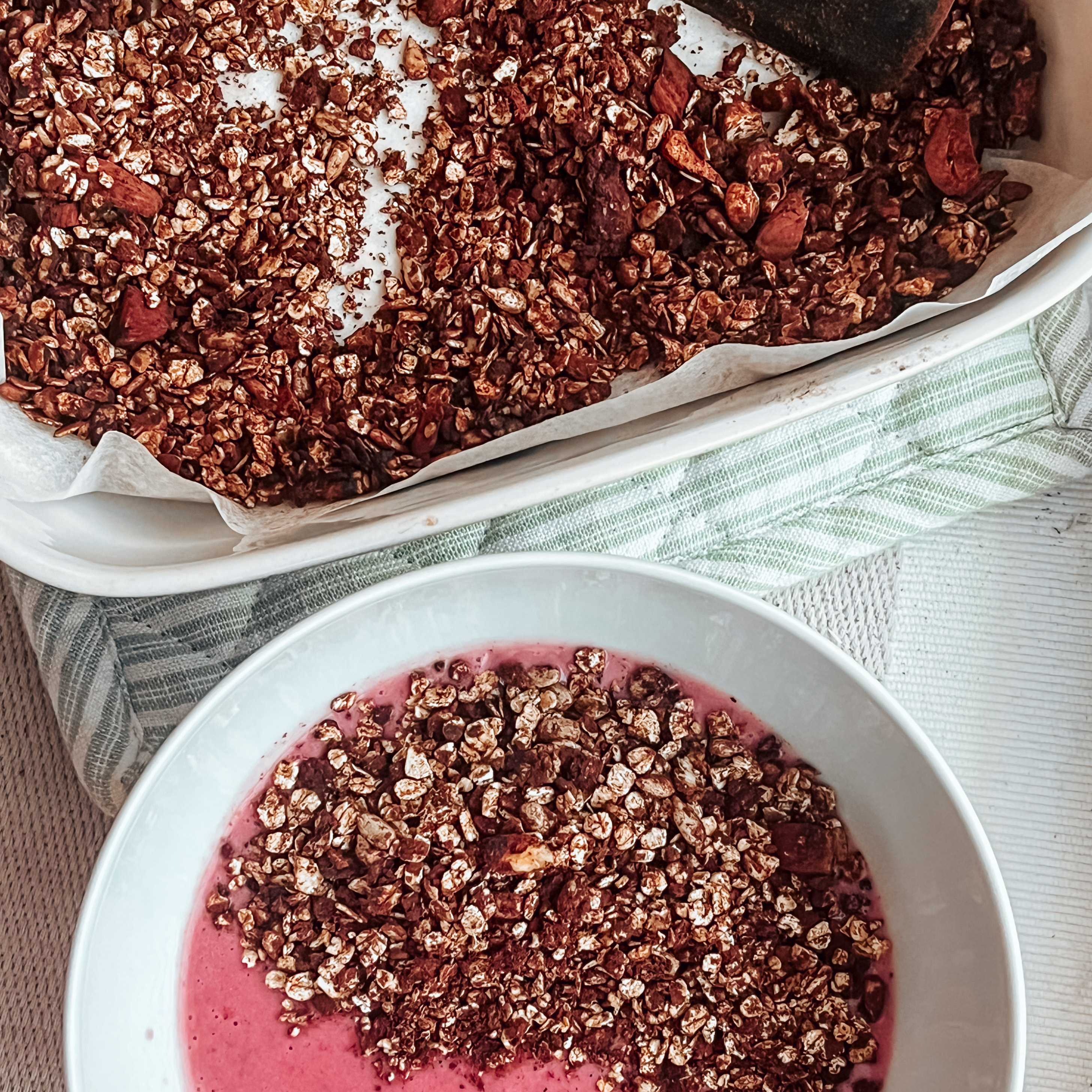 - haal de pan van het fornuis en top de smoothiebowl met de zelfgemaakte granola