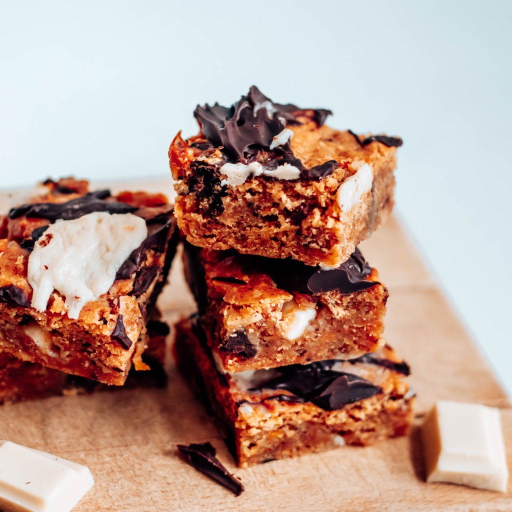 Vegan blondies gemaakt van zoete aardappel en tahin. Geloof me: de smaak van deze blondies is fan-tas-tisch. En nee, je proeft de zoete aardappel niet.