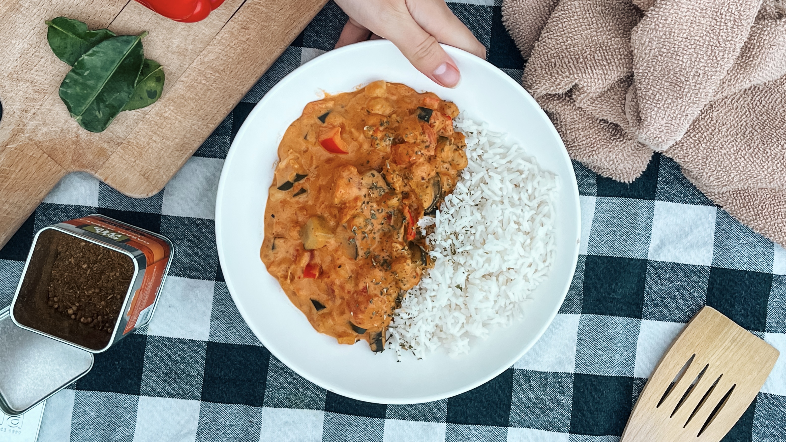 - Mocht je er vegan kipstukjes doorheen doen: bak deze in een aparte pan en voeg deze pas als allerlaatste door de curry. Zo behoudt de ‘kip’z’n bite.